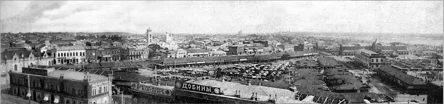 ![]() Рыночная площадь Царицына до 1917 года. Улица, впоследствии получившая имя Островского, начинается у левой границы кадра и уходит вправо в глубину, к месту, где теперь расположен перекресток Комсомольской и проспекта Ленина |