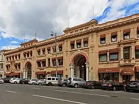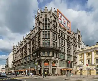 В 1908 году здесь был построен большой магазин фирмы «Мюр и Мерилиз» по проекту Р. И. Клейна[12][13], после чего начало Петровки оказалось «зажатым» между двумя массивными сооружениями — Большим театром и ЦУМом. Стилистически здание из стекла и железобетона было решено в формах английской готики. Металлические конструкции для здания были выполнены по проекту инженера В. Г. Шухова. В здании действовали электрические лифты для покупателей — новинка для Москвы начала XX века[13]. Новаторский облик здания, возведённого в историческом центре Москвы, вызвал споры среди современников. В советский период магазин «Мюр и Мерилиз» был преобразован в Центральный Универсальный магазин. В 1974 году к старому ЦУМу было пристроено новое здание[13]. В конце 1990-х — начале 2000-х годов была проведена масштабная реконструкция и перестройка здания магазина.