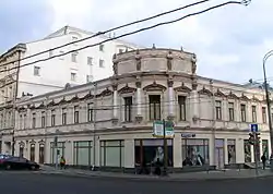 Угловое здание на перекрёстке с Кузнецким Мостом. По данным историка Москвы П. В. Сытина построено в 1821 году на парапете бывшего моста через Неглинную, давшего название улице Кузнецкий Мост[15]. Длительное время в нём располагалась гостиница «Лейпциг», впоследствии — «Россия». Остальную часть здания занимали дорогие и роскошные магазины, в том числе часовой магазин Павла Буре, магазин моды Лямина , Ювелирная мастерская К.Бок и другие. Здание неоднократно перестраивалось, характерную лепнину и оригинальный угловой аттик дом обрёл в 1850-х годах.