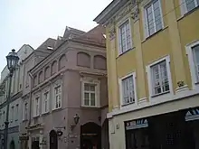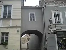 Соседний жилой дом, сейчас с магазинами на первом этаже, был построен в конце XVI — начале XVII века (Pilies g. 6 / Bernardinų g. 2). Фасад дома асимметричен; окна второго этажа украшают ренессансные обрамления. Его также завершает подобие аттика, выполняющего, однако, роль декоративного мотива без конструктивной функции. Прежний аттик над вторым этажом был заменён нынешней крыше в XVIII веке[4]. Арка соединяет это здание с трёхэтажным домом с фасадом, отмеченным скромным очарованием форм рококо второй половины XVIII века (Pilies g. 8). За аркой, соединяющей угловые дома, начинается узкая изогнутая улица Бернадину (Bernardinų gatvė, Zaułek Bernardyński; в советское время Пилес, Pilies). Она ведёт к костёлам Святого Михаила с бывшим монастырём бернардинок, Святой Анны и бернардинскому монастырю с костёлом Святого Франциска.