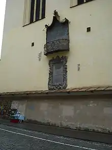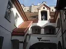 Напротив на углу улицы Швянто Йоно (Šv. Jono g., в советское время улица Б. Сруогос) возвышается восточный фасад костёла Святых Иоаннов. На внешней стене пресвитерия вмурована большая мраморная памятная таблица семейства Хрептовичей, украшенная в стиле рококо (1759). Над ней прежде находилось распятие с позолоченной фигурой Спасителя. На фасаде была большая фреска с изображением сцен эпидемии чумы 1710 года, закрашенная в XIX веке по распоряжению властей (Pilies g. 21).