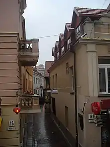 Напротив на углу с улицей Швянто Миколо (Šv. Mykolo g., в советское время улица Й. Билюно) высокий трёхэтажный дом с кафе, баром, галереей янтаря внизу (Pilies g. 16 / Šv. Mykolo g. 2). Улица Швянто Миколо ведёт к костёлу Святого Михаила.