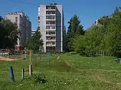 Левая и правая стороны улицы разнесены на 140 м друг от друга и застроены многоквартирными жилыми домами. В центральной части расположены мини-рынок «Западный», главный офис Новгородского отделения «Сбербанка России», школа-сад комплекс «Гармония».