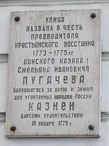 Первоначальное название улицы по уездному городу Царёву. В сентябре 1918 года переименована в Пугачёвскую.[1], в 2002 году переименована в улицу имени Пугачёва Е. И..