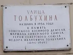 - Толбухина, улица // Имена московских улиц. Топонимический словарь / Р. А. Агеева, Г. П. Бондарук, Е. М. Поспелов и др.; авт. предисл. Е. М. Поспелов. — М.: ОГИ, 2007. — 608 с. — (Московская библиотека). — ISBN 5-94282-432-0.