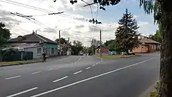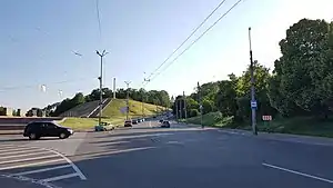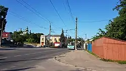 ![]() Перекрёсток с Лесковицкой улицей. Слева Болдины горы и Мемориал Славы. На заднем плане колокольня Троицкого собора. | |