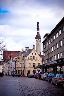 ![]() Улица Харью, справа - фасад Дома писателей, в перспективе улицы - башня Ратуши | |