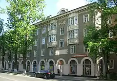 На месте многоэтажного жилого комплекса в начале улицы находилось двуххэтажное здание с магазином «Вина», который прозвали «Аптека», и нотариусом на втором этаже. Новое здание в постмодернистском стиле построено в конце XX — начале XXI века по проекту архитектора А. Н. Панина. Через дорогу от него находится здание лицея, построенное в 1930-е годы по проекту архитектора П. И. Клишева[3].