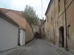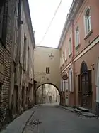 Недалеко от начала улицы находится примечательная поперечная арка, соединяющая дома по обеим сторонам улицы. Главное её назначение состояло в укреплении стен. Предполагается, что в старину под аркой были запирающиеся ворота. Она, как и арки на улицах Скапо и Бернардину, издавна привлекала художников и до сих пор становится сюжетом картин, гравюр, фотографий: арка вместе со слепыми стенами соседних зданий и уклоном мостовой создаёт впечатление таинственной суровой крепости. Таким изображён этот уголок города на акварели Станислава Флёри (1906), литографии А. Холера (1916), рисунке Мечисловаса Булаки (1949), линогравюре Йонаса Кузминскиса (1950)[2].