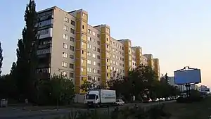 Парная и непарная стороны улицы заняты многоэтажной жилой (преимущественно 9-этажные дома, несколько 16-этажных домов) застройкой и учреждениями обслуживания — микрорайоны Лесного жилого массива.