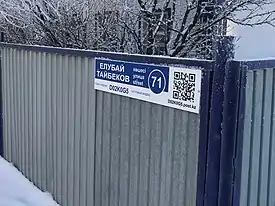 Таблички нового образца, которыми с 2016 года начали заменять старые указатели, помимо названия улицы на казахском языке (дублирование названия на русском или каком-либо другом языке не предусмотрено), также содержат: новые почтовые индексы (уникальные для каждого строения), QR-код и ссылку на сайт. Самостоятельно набрав адрес сайта в браузере или отсканировав QR-код с помощью приложения, можно попасть на специальную веб-страницу и узнать контактные данные обслуживающих организаций, оплатить коммунальные услуги и штрафы, разместить объявление и отправить электронное обращение в акимат[8].