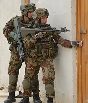 Основным назначением дополнительных элементов экипировки является повышение боевых возможностей её обладателя в условиях огневого контакта на улицах, под землёй и в помещениях. Наибольшую эффективность в тесноте улиц и помещений даёт применение штурмовыми группами компактного оружия (карабинов, пистолетов-пулемётов) и гранат (обычных, осветительных, дымовых и т. д.); наличие примкнутых штыков нежелательно, но каждый боец обязан иметь с собой боевой нож[13]. Помимо стандартного вооружения, штурмовая группа должна иметь средства для обеспечения вертикального и горизонтального манёвра в системе зданий и подземных коммуникаций: ломы, кирки, подрывные заряды, верёвки с кошками, верёвочные лестницы и т. п.[3][13].