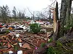 Крепкие, хорошо построенные дома разрушает до основания (либо срывает их с фундамента); наносит серьёзные повреждения железобетонным конструкциям; высокие здания серьёзно повреждены (в лучшем случае - отделываются выбитыми окнами, в худшем случае - разрушаются полностью); некоторые автомобили, грузовики и вагоны отбрасываются смерчем примерно на 1 милю (1,6 км). Сдирает кору с деревьев, может сорвать асфальт и разрушить мосты. |