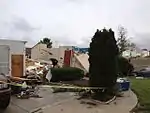 Срывает крыши; переворачивает или сильно повреждает мобильные дома; ломает наружные двери и окна, перемещает автомобили; некоторые крупные деревья вырывает с корнем и уносит. |