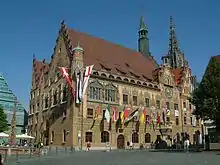 - Ульмская ратуша — одна из крупнейших по размерам ратуш средневековой Германии. В старейшей части восходит к 1370 году; перестроена, расписана снаружи и приобрела нынешний вид в эпоху Возрождения (XVI век); отреставрирована и частично перерасписана в 1905 году. На фасаде — астрономические часы XVI века.