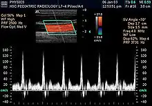 - Color doppler (CFM или CFA) — цветовой доплер (Color Doppler) — выделение на эхограмме цветом (цветное картирование) характера кровотока в области интереса. Кровоток к датчику принято картировать красным цветом, от датчика — синим цветом. Турбулентный кровоток картируется сине-зелено-желтым цветом. Цветовой доплер применяется для исследования кровотока в сосудах, в эхокардиографии. Другие названия технологии — цветное доплеровское картирование (ЦДК), color flow mapping (CFM) и color flow angiography (CFA). Обычно с помощью цветового доплера, меняя положение датчика, находят область интереса (сосуд), затем для количественной оценки используют импульсный доплер. Цветовой и энергетический доплер помогают в дифференциации кист и опухолей, поскольку внутреннее содержимое кисты лишено сосудов и, следовательно, никогда не может иметь цветовых локусов.