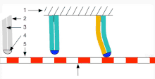На «гибкий» статор (тонкая биморфная пластина, чем тоньше пластина, тем больше амплитуда колебаний и тем ниже частота резонанса) «подаётся» переменное напряжение высокой частоты, которое вынуждает его производить ультразвуковые колебания, формирующие механическую бегущую волну, которая и толкает (зацепляет) расположенный рядом ротор. При движении влево толкатель — расклинивает, при движении вправо — заклинивает. На этом принципе работают все пьезоэлектрические моторы с толкателями. Увеличивая число толкателей можно создавать моторы с огромными пусковыми моментами.