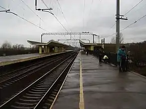 Платформа для поездов, следующих по направлению от Санкт-Петербурга, оборудована тремя боковыми сходами (лестницы со стороны пр. Народного Ополчения), кроме этого, имеется подземный переход, для перехода на 2 платформу к поездам, следующим по направлению к Санкт-Петербургу. На платформе есть кассы по продаже билетов. Центральные части платформ имеют навесы от осадков.