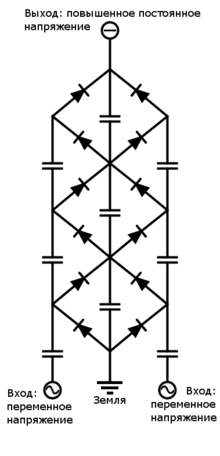 Умножи́тель напряже́ния (или каска́дный генера́тор[1]) — устройство для преобразования низкого переменного(пульсирующего) напряжения в высоковольтное постоянное напряжение. В отдельных каскадах переменное напряжение выпрямляется, а выпрямленные напряжения включаются последовательно и суммируются. Связь каскадов с источниками питания осуществляется через ёмкости или посредством взаимной индукции. Питание каскадов может быть как последовательным, так и параллельным.