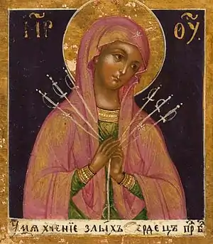 ![]() Богоматерь «Умягчения злых сердец» (фрагмент иконы «Нечаянная радость со 120 чудотворными иконами Богоматери», первая половина XIX века) | |