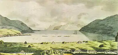 - Совершая кругосветную экспедицию на борту брига «Рюрик», Л. Хорис зарисовал вид на бухту Уналашки летом 1816 года.