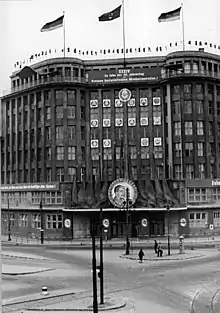 В начале 1920-х годов берлинский коммерсант еврейского происхождения Герман Голлубер, владелец компании посылочной торговли часами Jonass & Co., GmbH, приобрёл земельный участок, где размещался манеж 1-го гвардейского гренадерского полка имени императора Александра. В 1928—1929 годах на этом месте по заказу Голлубера и его компаньона Гуго Галле было возведено новое массивное здание в стиле новой вещественности по проекту архитекторов Густава Бауэра и Зигфрида Фридлендера. Здание предназначалось для кредитного универмага Jonaß & Co. AG площадью 15 тыс. м². Универмаг предоставлял населению возможность приобретать товары в рассрочку после уплаты четверти стоимости товара.