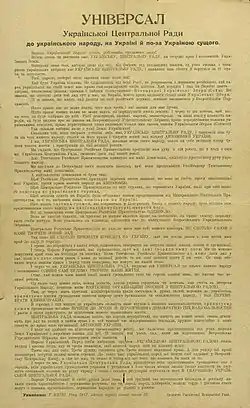 Универсалы Центральной рады Украинской Народной Республики — политико-правовые акты программного характера, издававшиеся Центральной радой, исполнявшей функции высшего законодательного органа Украины в 1917 году. Было издано четыре универсала, определивших этапы становления и развития украинской государственности от провозглашения формальной автономии в рамках единого российского государства до одностороннего провозглашения самостоятельности. Написаны по образцу одноимённых актов казацких гетманов 17-18 веков, автором[1] текста является Владимир Винниченко. Тексты Универсалов, приведённых в работах В. Винниченко, Д. Дорошенко, И. Мазепы и в ряде других изданий не всегда совпадают с оригиналами[2].