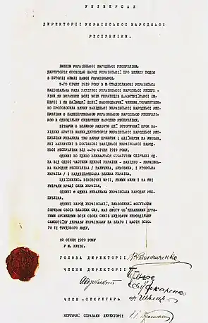 Директория УНР также издавала свои универсалы. В частности, 22 января 1919 года был оглашён Универсал Директории об объединении УНР и ЗУНР.