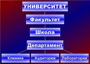 Наконец, лаборатории, аудитории и клиники — малые академические единицы, которые принадлежат департаменту, школе или факультету, и покрывают часть той или иной предметной области дисциплины.