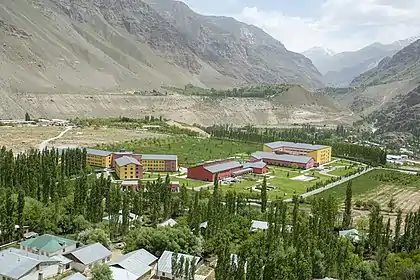 Университетский городок в Таджикистане расположен в Хороге, ГБАО, недалеко от границы с Афганистаном на юго-западе Памира на высоте 2200 м (7200 футов), на реке Гунт, где она впадает в Пяндж.[38]