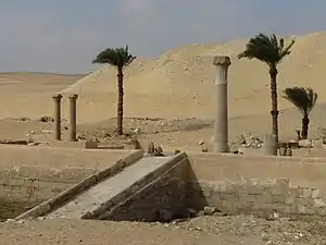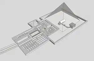 Примыкающий к восточной стене пирамиды заупокойный храм представляет собой конструкцию переходного типа, свидетельствующую о трансформации святилищ V династии в храмы VI династии. Он был исследован Барсанти, Масперо и Фирсом. Позднее работы на его территории велись Ж.-Ф. Лауэром. Храм имел внутренний дворик, который некогда окаймляли 16 колонн с капителями в форме пальм, характерными для V династии. Кладовые, числом более двадцати, находились к северу и югу от входа. Однако внутренняя, скрытая часть святилища полностью отвечала требованиям нового стиля. Там находился зал с пятью нишами, каждая из которых соответствовала одному из пяти имен фараона. Попасть в храм можно было через портал из красного гранита, сооружение которого было завершено уже во времена VI династии при фараоне Тети. В южной части храма, на границе между его открытой и закрытой для доступа частями, располагалась маленькая пирамида-спутник. Весь комплекс был окружен стеной, от которой сохранились лишь незначительные остатки. В её юго-восточном углу стояла культовая пирамида, имевшая в основании 12×12 метров. Севернее этой стены царь велел построить мастабы для своих жён Хенут и Небет, для дочери Идут и для нескольких сановников; их стены украшают великолепные многоцветные рельефы.
