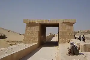Прекрасно реконструированная мощеная дорога ведёт от остатков двора верхнего заупокойного храма к нижнему храму. Она была обнаружена Селимом Хассаном. Некогда эта дорога имела длину 670 метров, ширину 6,7 метра, из-за неровностей рельефа дважды отклонялась от прямой, была ограждена известняковыми стенами, перекрытыми на высоте 3,2 метра каменными блоками. С внутренней стороны эти стены были украшены рельефами со сценами сражений и охоты, с бытовыми зарисовками, картинами земледельческих работ, с изображением мастерской скульптора. Среди изображенных на них сцен необходимо особо отметить не встречавшиеся прежде сюжеты, к которым относится, например, изображение умирающих от голода ливийцев. Другие сцены изображают доставку в Мемфис пальмовидных колонн судами из Асуана. Тонкий разрез в перекрытиях потолка этой дороги обеспечивал проникновение дневного света внутрь и позволял осматривать эти рельефы. Восходящая дорога плавно поднималась от одного храма к другому, скрадывая все неровности почвы. Чтобы сделать ее максимально прямой, строители засыпали более низкие участки, где ко времени царствования Униса уже находились частные гробницы. В качестве примера можно привести гробницу Нефера, внутри которой было найдено множество мумий.[7][8][9]
