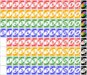 - Карты 4 цветов (синий, жёлтый, красный, зелёный) с номерами от 0 до 9 (76 шт, с цифрами от 1 до 9, по две одинаковых на каждый цвет, и четыре карты разных цветов с цифрой 0) — обычные карты.