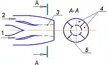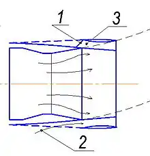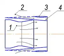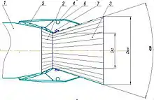 В исследуемом сопле выходной канал второго контура разделён продольными перегородками на четыре сектора с установленными на входе в каждый сектор устройствами регулирования расхода воздуха. Это сопло на режиме осевого истечения представляет собой сопло эжекторного типа с «жидкой» стенкой (рис. 4), однако в нём эжектируемый воздух поступает не из атмосферы, а из-за вентилятора, следовательно, имеет достаточно высокое давление. Стенка сопла первого контура разорвана сразу за его критическим сечением, поэтому выходящая из него струя газа расширяется, постоянно уменьшая к выходу площадь струи второго контура (перепад на вентиляторе околокритический).