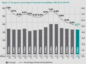 HMRC собрала для казначейства в 2016/17 году 557 миллиардов фунтов стерлингов.[26] По оценкам, общие теоретические налоговые обязательства в этот год составляли 590 млрд. фунтов стерлингов, однако 33 млрд. фунтов стерлингов не были собраны из-за "недополучения налогов", который состоит из денег, утерянных в результате уклонения от уплаты налогов, ошибок и неоплаченных налоговых долгов. Это соответствует уровню сбора 94,3% (по сравнению с 92,7 в 2005-2006 г.г.).[27] В конце марта 2009 года HMRC управлял 20 миллионами «открытых» дел (в департаменте были выявлены расхождения в отчетах налогоплательщиков, или же невозможность восстановления отчета), что может затронуть около 4,5 миллионов человек, которые возможно переплатили в общей сложности около 1,6 млрд фунтов стерлингов, и еще 1,5 млн. человек, которые, возможно, недоплатили в общей сложности около 400 млн. фунтов стерлингов.[28]