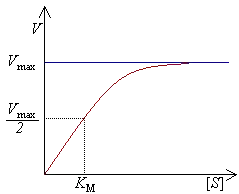 - — константа Михаэлиса. По определению, , где есть константа скорости реакции распада фермент-субстратного комплекса на фермент и исходный субстрат, есть константа скорости реакции образования фермент-субстратного комплекса и есть константа скорости реакции распада фермент-субстратного комплекса на фермент и продукт (см. ниже вывод уравнения для скорости реакции). Константа Михаэлиса численно равна концентрации субстрата, при которой скорость реакции составляет половину от максимальной[2];