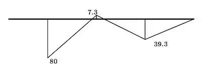 Складываем (по точкам) эпюры от нагрузки (рис. 3) и от моментов (рис. 4). Получаем эпюру моментов в балке (рис. 5).