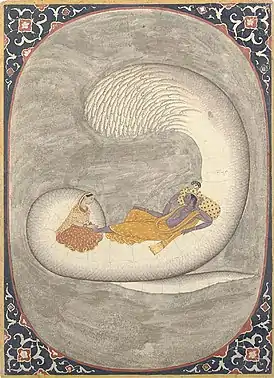 Изображение Шеши можно часто увидеть на картинах, изображающих свернувшуюся в клубок змею, на которой, скрестив ноги, восседает Вишну. Витки тела Шеши символизируют нескончаемый кругооборот времени[29]. В более широкой трактовке мифа огромных размеров змея (наподобие кобры) обитает в мировом океане и имеет сотню голов. Пространство же, скрываемое массивным телом Шеши, включает в себя все планеты Вселенной[30]; если быть точным, именно Шеша и держит эти планеты своими многочисленными головами, а также распевает хвалебные песни в честь Вишну[31]. Образ Шеши, помимо прочего, также использовался как защитный тотем индийскими махараджами, поскольку существовало поверье, будто змей, опоясавший своим телом землю, охраняет её от злых сил[32]. Само слово «Шеша» обозначает «остаток», что отсылает к остающемуся после того, как всё созданное вернётся обратно в первичную материю[33]. По мнению Клауса Клостермайера, философское толкование образа Шеши даёт возможность понять историю с точки зрения философии индуизма, согласно которой история не ограничивается человеческой историей на планете Земля или историей одной отдельно взятой вселенной: существует бесчисленное множество вселенных, в каждой из которых постоянно разворачиваются какие-то события[34].