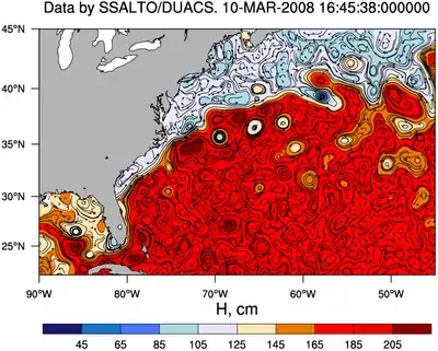 Высота морской поверхности (ВМП) — это высота (или топография или рельеф) поверхности океана. В течение суток она, очевидно, наиболее подвержена влиянию приливных сил Луны и Солнца, действующих на Землю. На больших временных масштабах на ВМП влияет циркуляция океана. Обычно циркуляция океана вызывает отклонения топографии от среднего уровня максимум на ± 1 м[4]. Самые медленные изменения ВМП происходят за счёт изменений в гравитационном поле Земли (геоид) в результате перераспределения континентов, образования подводных гор и тому подобного.