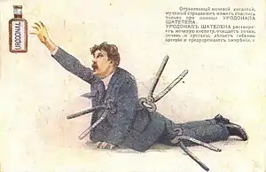 - Уродонал Шателена. Реклама. Россия, 1910-е годы. На клещах надпись: «Мочевая кислота» (фр. Acide urique)