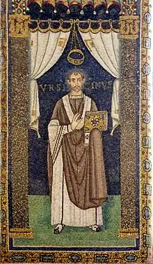 - B. Apolenaris Sacerdotis Basilicam mandante Ursicino Episcopo a fundamentis Iulianus Argentarius aedificavit, ornavit atque dedicavit consecrante Maximiano Episcopo.