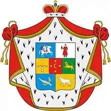 Описание герба: Выписка из Гербовника В щите, разделенном на шесть частей, в середине находится малый щиток красного цвета с изображением золотой луны, окружённой четырьмя шестиугольными звёздами того же металла. В первой части в голубом поле ездок, скачущий на белом коне, держит в левой руке стрелу. Во второй в серебряном поле муж в Татарском одеянии имеет на правой руке птицу. В третьей в золотом поле лук со стрелой, вверх летящей. В четвертой в зеленом поле изображён золотой лев, пронзённый в челюсть двумя стрелами. В пятой в голубом поле означен (летящий) дракон. В шестой части в золотом поле агнец. Щит покрыт мантией и шапкой, принадлежащими Княжескому достоинству. |
