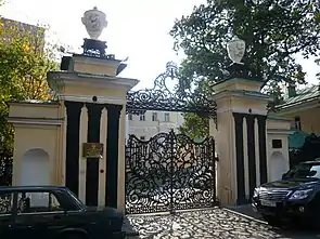 Ограда и ворота усадьбы являются образцом русского литейного искусства 50-х годов XVIII века. Фантазия и мастерство авторов превратили тяжёлую чугунную решётку в воздушное, кажущееся почти невесомым кружево. Решётка была выполнена по чертежам Ф. С. Аргунова и отлита крепостным мастером Д. Т. Сизовым на одном из нижнетагильских Демидовских заводов в 1760-х гг. В усадьбу она была перенесена из большого демидовского дворца на Вознесенской улице[4].