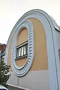 Конюшенный дворовый корпус, Т-образный в плане, со всех сторон оканчивался мощными округлыми объёмами. На Семашко выходил один из торцов здания с огромным округлым окном. Оригинально решён был дворовый въезд в конюшни в виде заглублённой ребристой раковины. Над воротами был устроен овальный оконный проём с мелкой решёткой остекления (заполнение утрачено)[3].