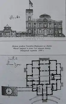 Графский особняк был построен в начале 1890-х годов согласно моде своего времени — делать загородные дома с круговыми верандами и равноценными фасадами, чтобы здание одинаково эффектно смотрелось с каждой стороны[2]. В период владения семьёй Стенбок-Фермор фасады особняка были окрашены в белый цвет, за он что получил прозвище «Белый замок»[4]. Его интерьеры были оформлены с типично барочной роскошью — мраморные полы, камины, масса лепнины, дорогой паркет. Парадная лестница работы известного скульптора Грациозо Ботта вела на второй этаж в зал для приёмов, где находились камин с облицовкой голландским кирпичом и «археологическая редкость» — трон[5][6][7].