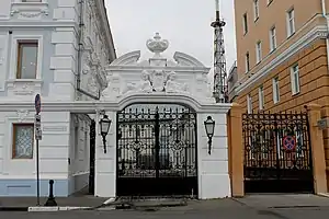 Участок усадьбы ограждён высокохудожественной кирпичной оградой с воротами и калиткой. Ворота воссозданы в ходе реставрации, в частности заполнение высокохудожественного литья, восстановленное по фотографиям[3].
