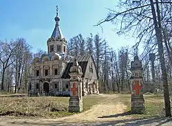 С разрешения Владимирской епархии в течение четырёх лет недалеко от главного дома была выстроена усадебная церковь с одним престолом во имя мученицы царицы Александры, освящённая в 1899 году в день памяти равноапостольного князя Владимира (15 июля по старому стилю)[10]. При строительстве церкви, спроектированной в неорусском стиле, долго копившееся недовольство друг другом наконец привело к разрыву между заказчиком и архитектором[6].