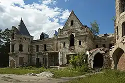 Западная часть здания — двухэтажная постройка с одной трёхъярусной и другой, примыкавшей к зданию с юго-запада, круглой башнями. Круглая башня венчает также фасад южного четырёхэтажного крыла замка, пристроенного в 1906 году[11]. Планировка помещений дворца была решена с помощью анфилад различной этажности. Во дворце находилось более 80 различных помещений, гостиных и жилых комнат. Проект был реализован с учётом всех нововведений: электрическое освещение построек и парка от автономного локомобиля, центральное отопление, водопровод от парового насоса и двух водонапорных башен, канализация, телефон в комнатах, собственная телеграфная станция[11].