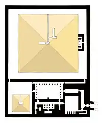 Покрытый гранитом вход в подземные покои пирамиды, находится с северной стороны, но уже не на некоторой высоте как в пирамидах IV династии, а был расположен на уровне земли. Он был обнаружен Перрингом и Визом. Оттуда ведёт вниз сначала нисходящий ход, который переходит в горизонтальную штольню. За блокирующим устройством имеется ответвление на восток к T-образной камере для погребальной утвари. Главный проход ведёт дальше на юг к помещению, к которому с запада примыкала погребальная камера, находящаяся примерно на 10 метров ниже основания пирамиды. Камера имеет размеры (7,8 × 3,1 метра) и на её полу были найдены остатки базальтового саркофага, разбитого грабителями, которые проникли в пирамиду по специально прорубленной для этой цели шахте.[9][10]