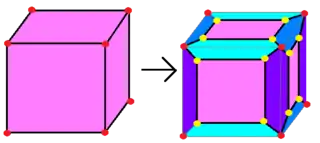 Усечение рёбер — это снятие фаски с многогранника, как в случае всестороннего усечения, но вершины при этом остаются, а рёбра заменяются шестиугольниками. В 4-мерном многограннике рёбра заменяются на удлинённые бипирамиды.